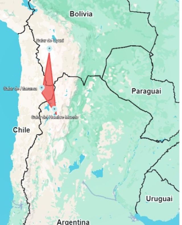 O chamado Triângulo do Lítio é uma vasta região de salares existentes na região da Tríplice Fronteira entre a Argentina, a Bolívia e o Chile, delimitados pelo Salar de Uyuni (Bolívia), Salar de Atacama (Chile) e pelo Salar do Homem Morto (Argentina). De acordo com dados do United States Geological Survey1 (USGS), a região abriga aproximadamente entre 70% a 80% de todas as reservas de lítio do planeta, o que em um futuro próximo tende a tornar a região uma das mais importantes regiões geoestratégicas do mundo.